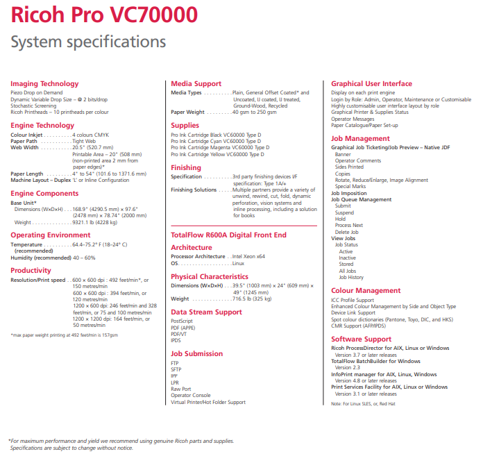 La Pro VC70000 de Ricoh nace para acelerar la transición de los grandes volúmenes del offset al digital. Permite a imprentas comerciales producir aplicaciones de gran calidad y exigencia, como catálogos y revistas, que tradicionalmente solo podían imprimirse en equipos offset. Además, combina este alto nivel de calidad de impresión con las exigencias de las aplicaciones de impresión de producción de alta velocidad como el marketing directo y las comunicaciones críticas, lo que la convierte en la impresora digital de alta calidad y alta velocidad más versátil del mercado. Gracias a nuestra nueva y ampliada gama de tintas que no precisan un pre-tratamiento y nuestro nuevo sistema de secado avanzado, la Pro VC70000 de Ricoh maximiza la capacidad de producción y ofrece a los usuarios la posibilidad de imprimir a mayor velocidad sobre una amplia gama de formatos, incluidos tanto el papel offset estucado como el papel no estucado.