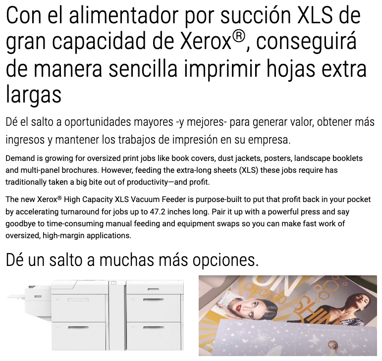 | Prestaciones opcionales | • Tintas secas especiales: Blanco, transparente, oro y rosa fluorescente (ampliando el gamut de color de forma automática); agrega uno o dos módulos de tinta seca especial además de los 4 colores estándar para CMYK hasta un total de 6 colores en línea. • Tinta seca transparente de bajo brillo para ampliar y mejorar la calidad en infinidad de soportes de impresión • Alimentación, apilamiento y acabado de alta capacidad, incluida la productividad acelerada para materiales de hasta 330 mm x 1,2 m con los alimentadores por succión XLS de alta capacidad de Xerox® y Plockmatic MPS (Apilador de uso general) XL • Kit de alimentación automática XLS de Xerox para una alimentación productiva de formatos XLS • Acabado en línea de folletos apaisados A4 a sangre en formatos XLS para acabadoras Plockmatic PowerSquare 160 o C.P. Bourg Booklet Maker (BM-e) |